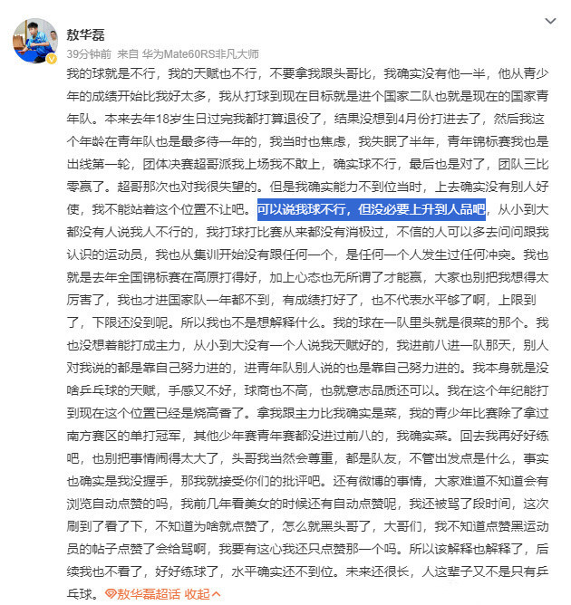 紧接着敖华磊在男单履历赛中1-4不敌广西选手何京林,爆冷出局,赛后,他连发两篇长文,不仅自我谈论还央求宽厚,执行令东说念主唏嘘,敖华磊宣称“于理确乎没抓手,采纳月旦”,但强调“绝非很是,更不敢不尊重王楚钦”