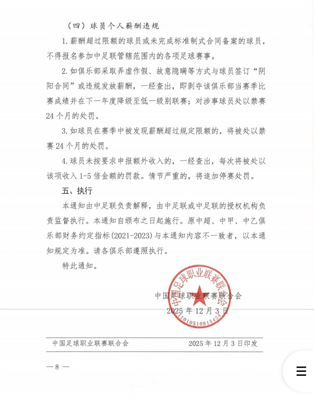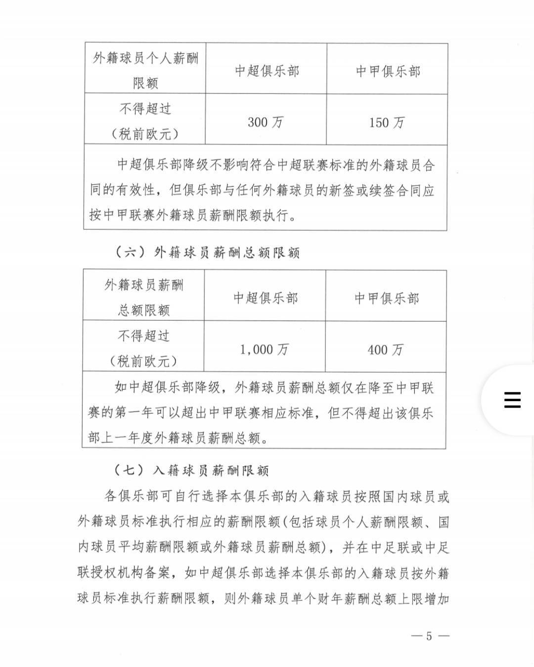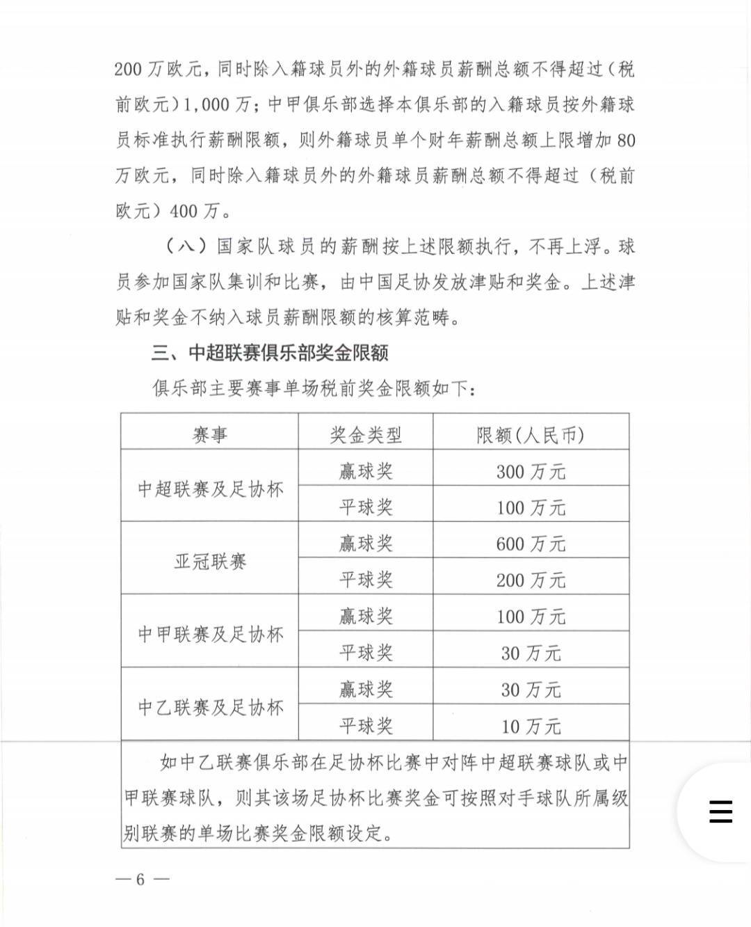 中超俱乐部外助个东谈主薪酬不得越过300万欧元(税前),中甲俱乐部外助个东谈主薪酬不得越过150万欧元(税前)。