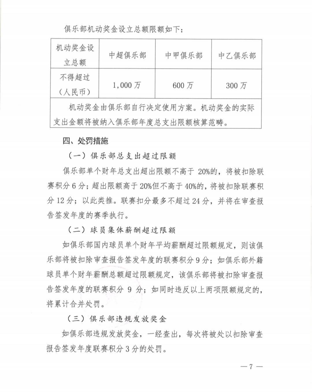 中超俱乐部外助薪酬总数不得越过1000万欧元(税前),中甲俱乐部外助薪酬总数不得越过400万欧元(税前)。中超俱乐部国内球员平均薪酬名额不得越过500万元(税前),中甲国内球员平均薪酬名额不得越过300万元(税前),中乙国内球员平均薪酬名额不得越过50万元(税前)。