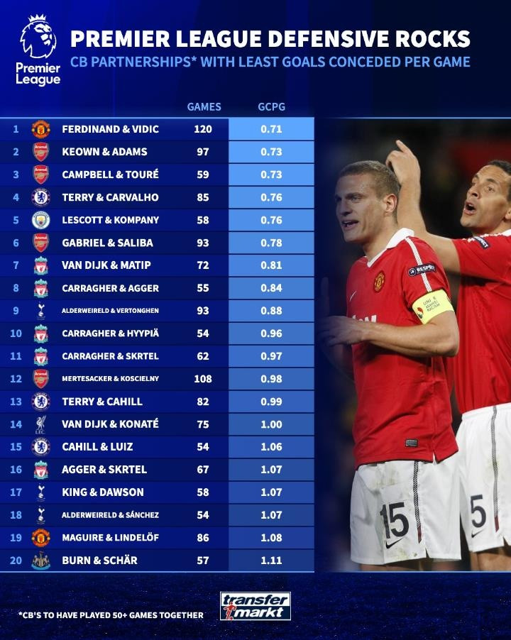 1.费迪南德、维迪奇(曼联):搭档120场,场均丢球数0.71个